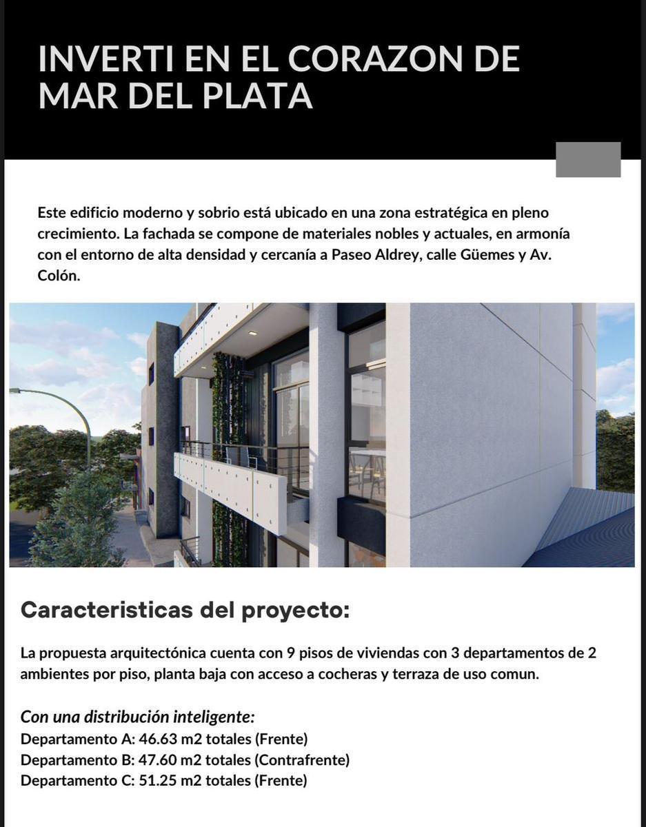 INVERTÍ EN EL CORAZÓN DE MAR DEL PLATAEste edificio moderno y sobrio está ubicado en una zona estratégica en plenocrecimiento. La fachada se compone de materiales nobles y actuales, en armoníacon el entorno de alta densidad y cercanía a Paseo Aldrey, calle Güemes y Av.Colón.La propuesta arquitectónica cuenta con 9 pisos de viviendas con 3 departamentos de 2ambientes por piso, planta baja con acceso a cocheras y terraza de uso común.Con una distribución inteligente:Departamento A: 46.63 m2 totales (Frente)Departamento B: 47.60 m2 totales (Contrafrente)Departamento C: 51.25 m2 totales (Frente)Descubre la oportunidad perfecta para invertir o vivir en el corazón de Mar del Plata! Presentamos un impresionante edificio en pozo que promete ser la joya del centro de la ciudad. Este proyecto de vanguardia combina diseño moderno, comodidad y una ubicación inigualable para ofrecerte lo mejor de la vida urbana.Características Principales:Ubicación Privilegiada: Situado en el centro de Mar del Plata, estarás a pocos pasos de las principales avenidas, tiendas, restaurantes, y puntos de interés. ¡Todo lo que necesitas al alcance de tu mano!Diseño Moderno: Arquitectura contemporánea con acabados de alta calidad que reflejan estilo y elegancia en cada rincón.Comodidades Exclusivas: Disfruta de amenities de primer nivel como gimnasio, piscina, salón de usos múltiples y seguridad las 24 horas.Unidades Versátiles: Departamentos de 1, 2 y 3 ambientes, ideales para solteros, parejas y familias. Cada unidad está diseñada para maximizar el confort y la funcionalidad.Inversión Inteligente: Con el mercado inmobiliario en constante crecimiento, este edificio ofrece una excelente oportunidad para quienes buscan obtener una alta rentabilidad a futuro.Consulta valores y unidades disponibles! Nota: las medidas expresadas en mts y mts2 son aproximadas