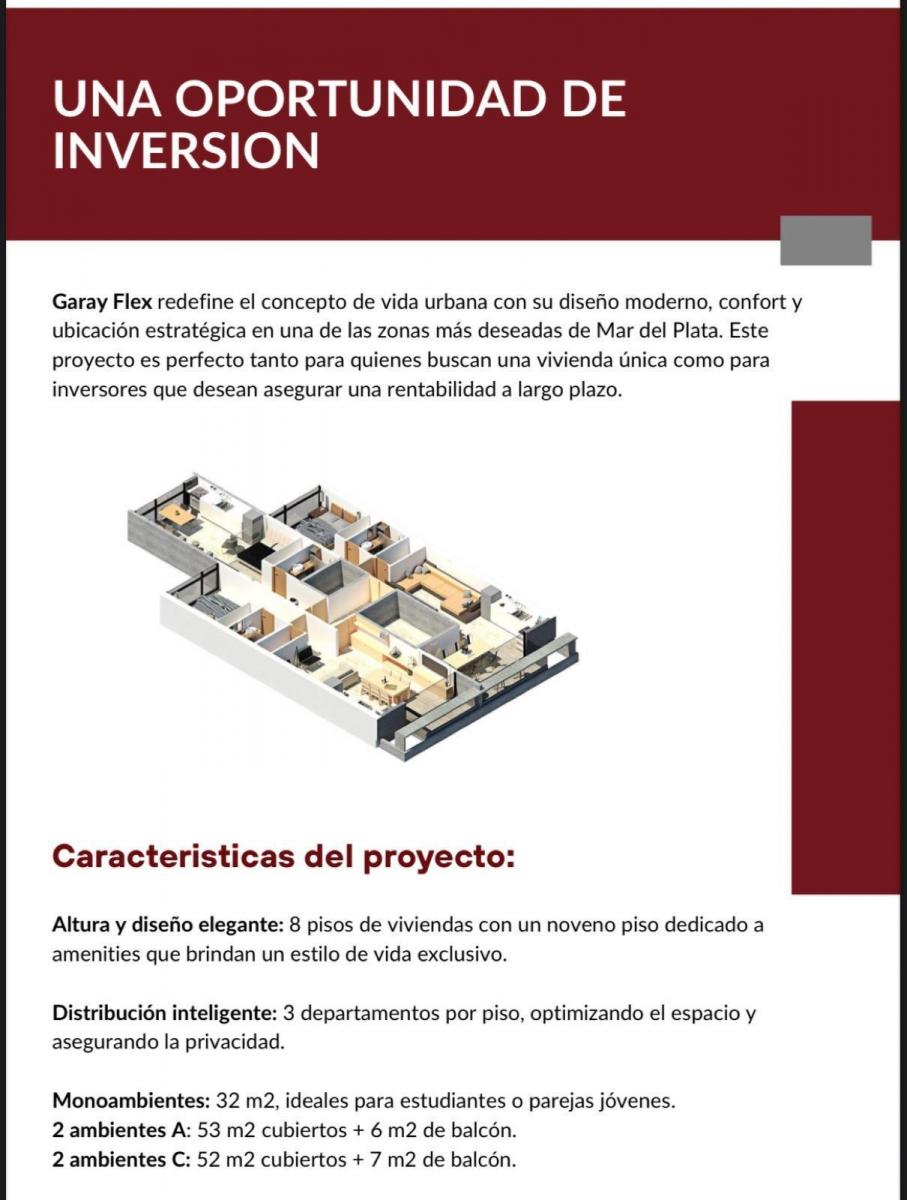 Altura y diseño elegante: 8 pisos de viviendas con un noveno piso dedicado aamenities que brindan un estilo de vida exclusivo.Distribución inteligente: 3 departamentos por piso, optimizando el espacio yasegurando la privacidad.Monoambientes: 32 m2, ideales para estudiantes o parejas jóvenes.2 ambientes A: 53 m2 cubiertos + 6 m2 de balcón.2 ambientes C: 52 m2 cubiertos + 7 m2 de balcónABERTURAS EXTERIORESCarpintería de alta prestación con doblevidriado hermético (DVH), garantizando elaislamiento térmico y acústicoPISOSPorcelanato rectificado símil madera entodos los ambientes, que aporta calidez ysofisticación a cada rincón del hogar.BAÑOSEquipados con grifería de alta gama(Ferrum o similar), los baños son unreflejo de diseño y funcionalidad.revestimientos en baño y toilete líneabios 1era 7.5x30CONFORTCalefacción por piso radiante y provisión de aguacaliente central, brindando máximo confort en todomomento.Preinstalación de aire acondicionado en cadaunidadTECNOLOGÍA Y SEGURIDADSistema de circuito cerrado de TV y porterovisor de 7” en cada unidad. Iluminación LED enzonas comunes y departamentos, con luz decortesía en pasillos y entradas.COCINAcocina integradaHorno y anafe vitroceramico electrico porseparado.mesadas de granito.amoblamiento a medidaConsulta por valores y disponibles! Nota: las medidas expresadas en mts y mts2 son aproximadas.