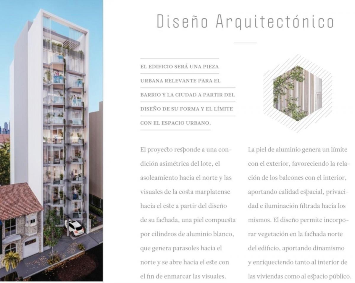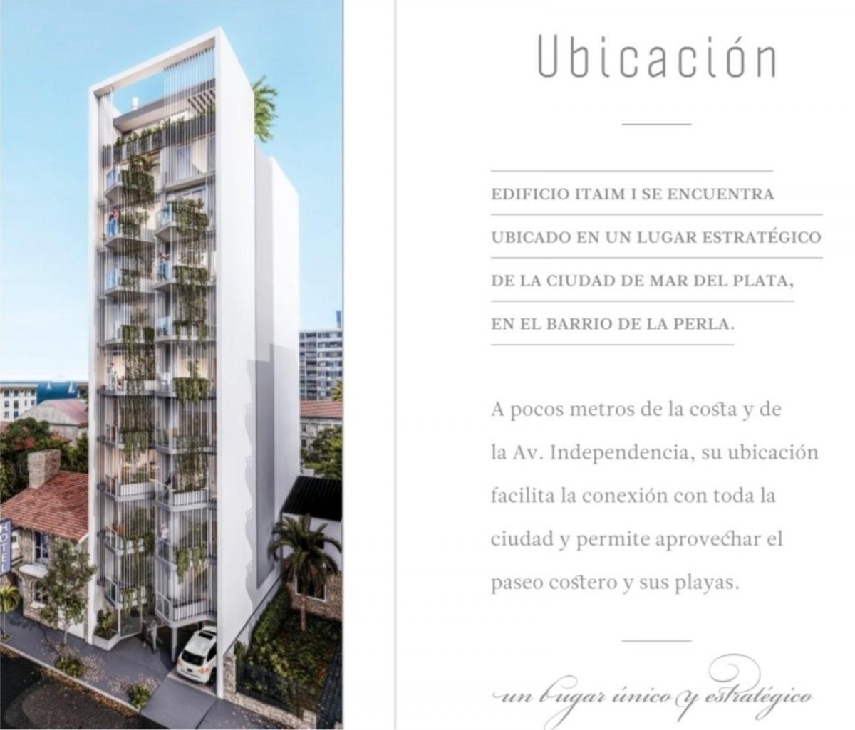 EDIFICIO ITAIM I SEMIPISO 2 AMB C COCHERA LA PERLAEdificio Itaim I ubicado en Ayacucho 3242, entre Av Independencia y Salta, a metros del marSe encuentra ubicado en un lugar estrategico de la ciudad de Mar del Plata, en el barrio de La PerlaA pocos metros de la costa y de la Av.Independencia, su ubicacion facilita la conexion con toda la ciudad, y permite aprovechar el paseo costero y sus playas.El edificio sera una pieza urbana relevante para el barrio y la ciudad a partir del diseño de su forma y el limite con el espacio urbanoEl proyecto responde a una condicion asimetrica del lote, el asolamiento hacia el norte y las visuales de la costa marplatense hacia el este a partir del diseño de su fachada, una piel compuesta por cilindros de alumio blanco, que genera parasoles hacia el norte y se abre hacia el este con fines de enmarcas la visuales.La piel de aluminio genera un limite con el exterior, favoreciendo la relacion con los balcones con el interior, aportando calidad filtrada hacia los mismos. El diseño permite incorporar vegetacion en la fachada norte del edificio, aportando dinamismo, y enriqueciendo tanto al interior las vivienda como al espacio publico.La eleccion de los materiales constructivos fue realizada con el fide de que ITAM I sea un edificio con una imagen singular, de alta calidad y bajo mantenimiento, por tal motivo los materiales de la fachada son: aluminio, hormigo visto y revoque pintado blanco.Materiales y terminacionesCalefaccion por losa radianteCarpínteria DVH de primera lineaMuebles de cocina de primera calidadGriferia FV o similarSanitarios ferrum o similarCerradura magnetica en hall de accesoCamaras de seguridadPortero VisorPisos de porcelanatto de gran tamañoPiel arquitectonia de aluminioOfrecemos en VENTA Semipiso de 2 ambientes con balcon, de 67,91m2. La unidad cuenta con cochera fija cubierta.OPORTUNIDAD CONTADO U$S 125.000... Entrega programada diciembre 20 26.Consultanos...