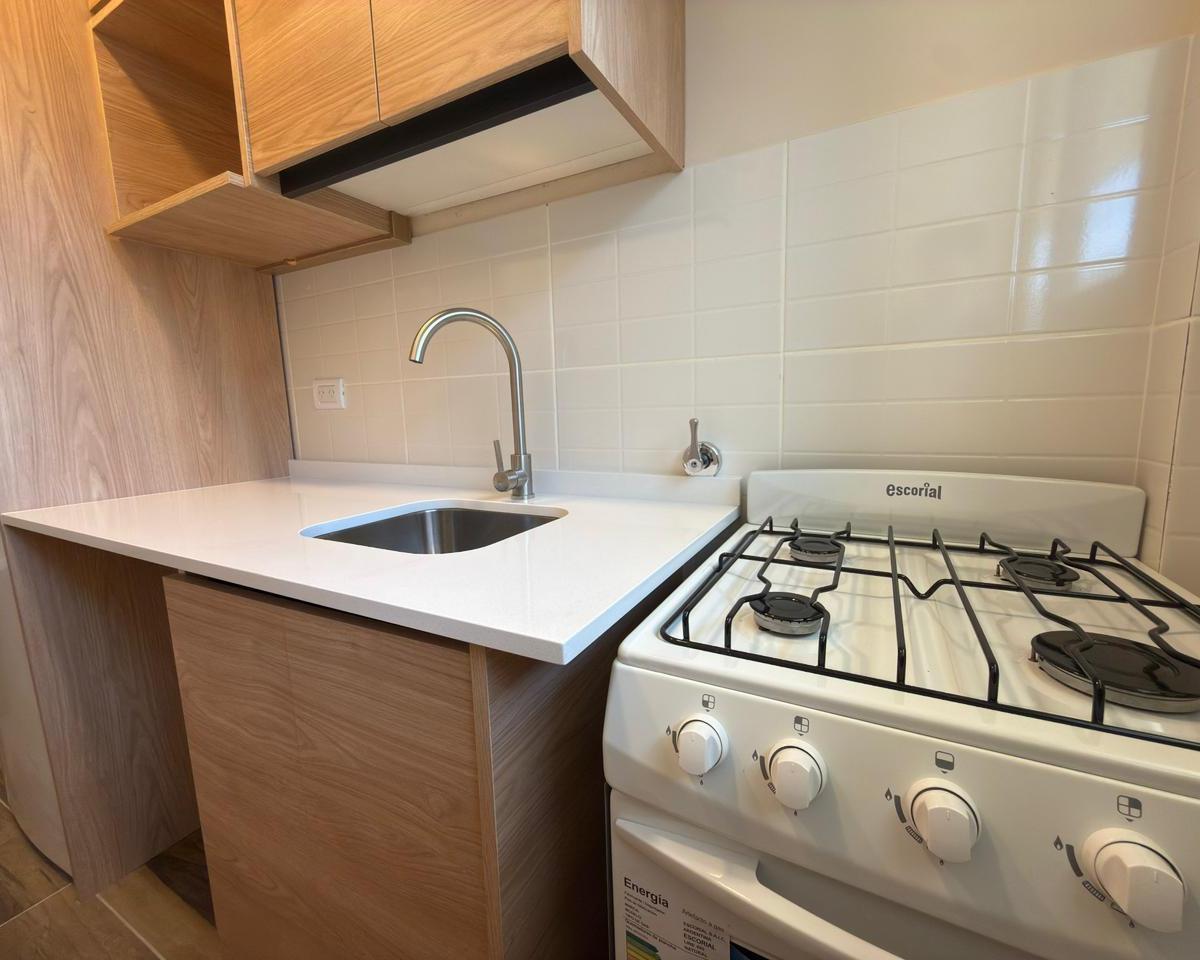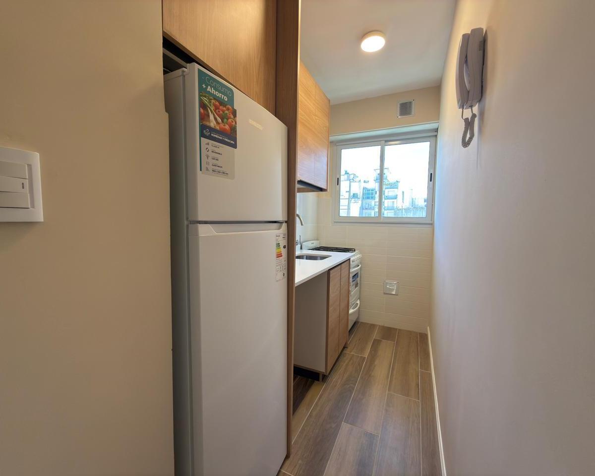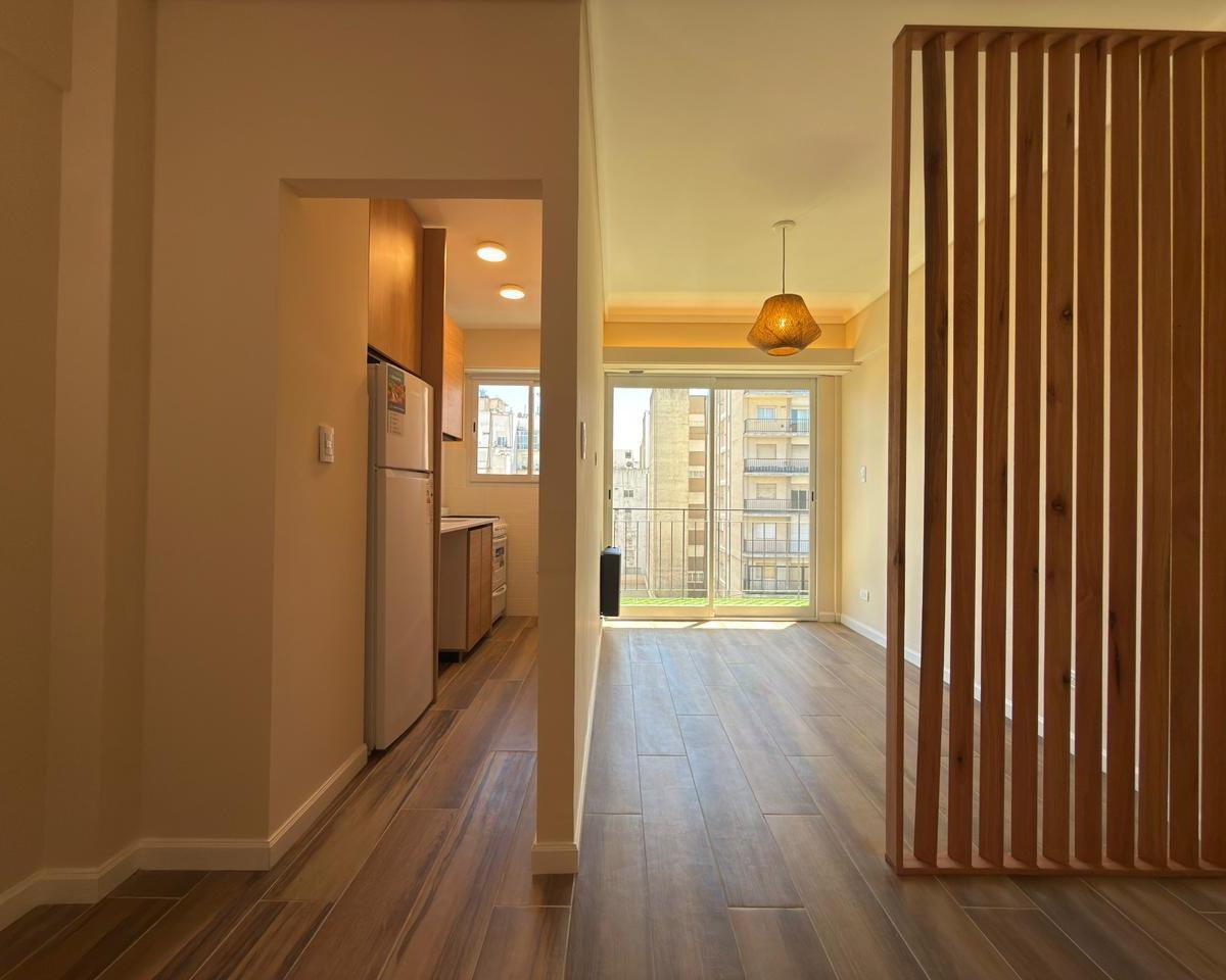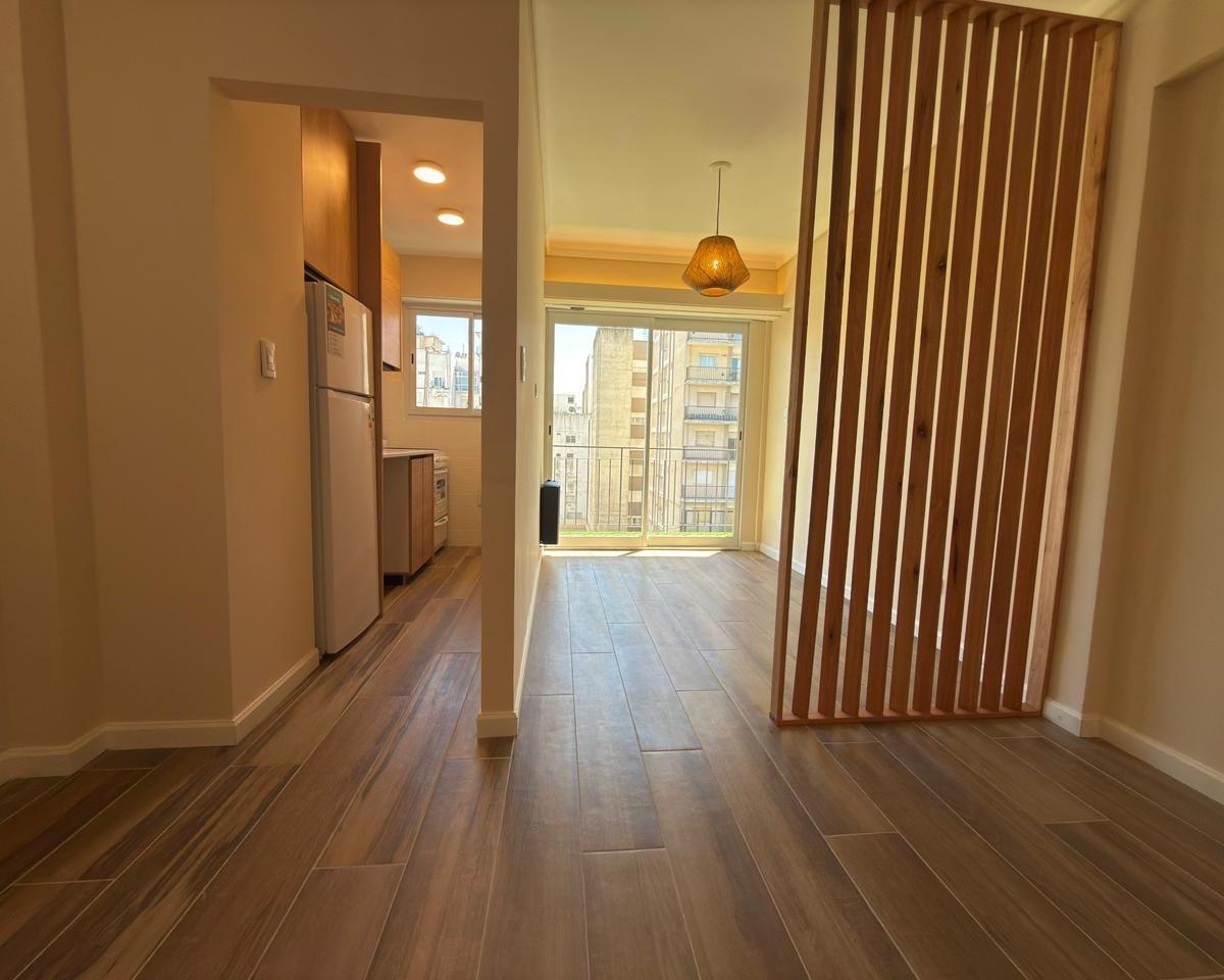 Ambiente de gran tamaño con amplio patio.El ambiente es en concepto desplazado (dividido) al lateral. Se encuentra reciclado Ambiente dividido con amplio ventanal de piso a techo súper luminoso, cama sommier a estrenar de dos plazas, resplado de cama con mesas de luz incorporadas, mesa con 4 sillas a estrenar, rack con TV Smart 32 pulgadas nuevo, aire acondicionado frio calor, plantas, perchero de pie, cortinas, acolchado y decoración.Caja fuerte.PERSIANA ELÉCTRICA.REFACCIONADO. ( se cambiaron cañerías de cocina y baño). Obra de gas hecha en el edificio. Al departamento se le bajaron los techos (COCINA Y BAÑO). Cocina separada con lavadero (equipada con lavarropas a estrenar marca Philips, heladera con freezer nueva marca Philips, microondas nuevo marca Atma, pava eléctrica marca Atma nueva, tostadora nueva marca Atma, cocina semi industrial marca Escorial nueva, extractor TSC nuevo). BODEGA CON VINOS, vajilla, cubiertos tipo hotel, utensilios de cocina Hudson, cafetera estilo italiana Hudson, cacerola Hudson, sarten Hudson, cuchilla Hudson. SUPER COMPLETO.Cortinado a estrenar. (COCINA Y AMBIENTE). SE ENTREGA CON VAJILLA PARA DOS PERSONAS, SÁBANAS Y TOALLAS. (NO LE FALTA NADA. LISTO PARA HABITAR O ALQUILAR).Baño completo con mampara, inodoro y bidet Ferrum línea Bari, vanitory madera blanca laqueado, griferia Piaza, secador de pelo (tipo hotel) y todo el equipamiento de baño.PATIO, detalles en madera, mobiliario, iluminación solar, salida de agua nueva y gas (para futura parrila gas).VALOR: U$S 68.900Mts 24 cubiertos aprox.Mts 19 descubiertos aprox.Total aprox. 43. MtsExpensas $ 110.000 aprox.Nota: las medidas expresadas en mts y mts2 son aproximadas.