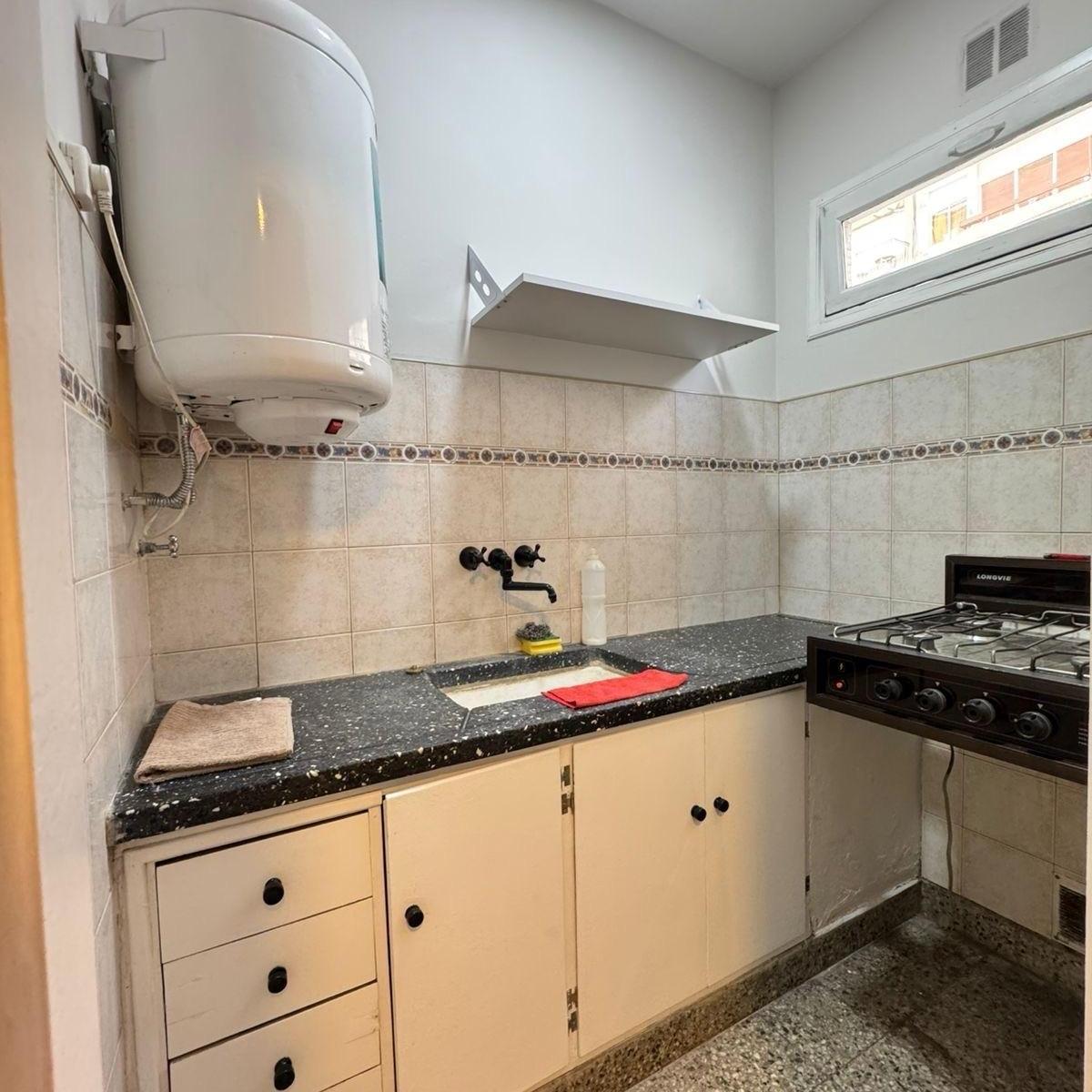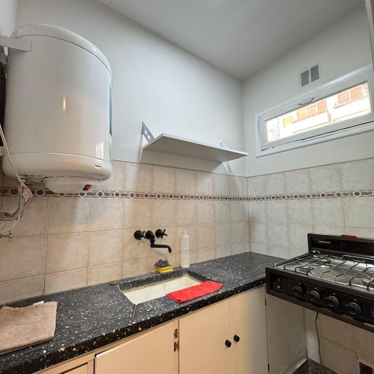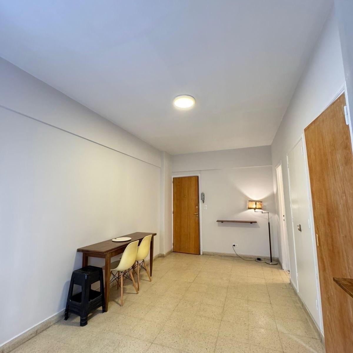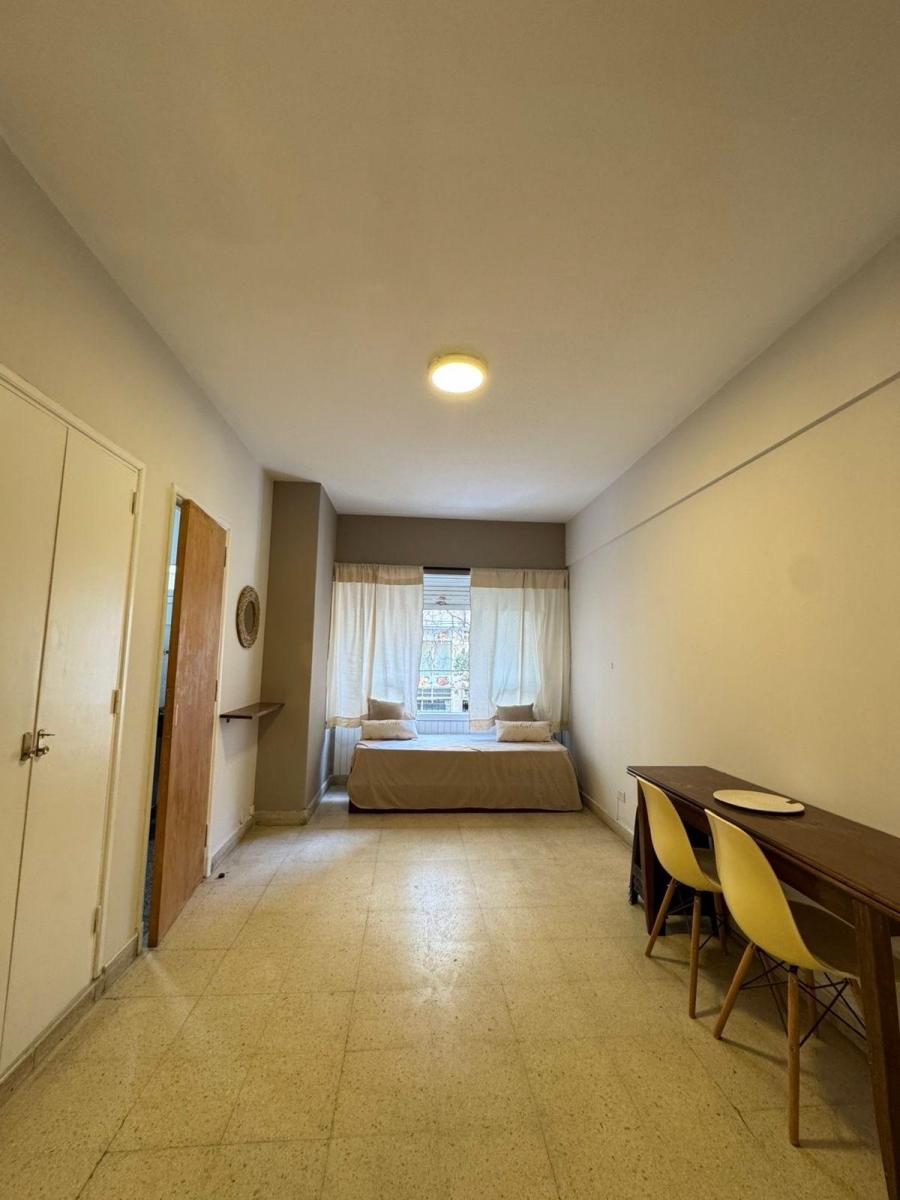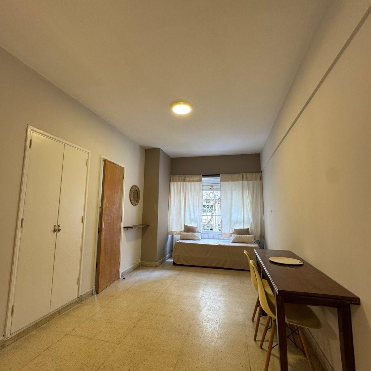 Ambiente de gran tamaño con amplio patio.El ambiente es en concepto desplazado (dividido) al lateral. Se encuentra reciclado Ambiente dividido con amplio ventanal de piso a techo súper luminoso, cama sommier a estrenar de dos plazas, resplado de cama con mesas de luz incorporadas, mesa con 4 sillas a estrenar, rack con TV Smart 32 pulgadas nuevo, aire acondicionado frio calor, plantas, perchero de pie, cortinas, acolchado y decoración.Caja fuerte.PERSIANA ELÉCTRICA.REFACCIONADO. ( se cambiaron cañerías de cocina y baño). Obra de gas hecha en el edificio. Al departamento se le bajaron los techos (COCINA Y BAÑO). Cocina separada con lavadero (equipada con lavarropas a estrenar marca Philips, heladera con freezer nueva marca Philips, microondas nuevo marca Atma, pava eléctrica marca Atma nueva, tostadora nueva marca Atma, cocina semi industrial marca Escorial nueva, extractor TSC nuevo). BODEGA CON VINOS, vajilla, cubiertos tipo hotel, utensilios de cocina Hudson, cafetera estilo italiana Hudson, cacerola Hudson, sarten Hudson, cuchilla Hudson. SUPER COMPLETO.Cortinado a estrenar. (COCINA Y AMBIENTE). SE ENTREGA CON VAJILLA PARA DOS PERSONAS, SÁBANAS Y TOALLAS. (NO LE FALTA NADA. LISTO PARA HABITAR O ALQUILAR).Baño completo con mampara, inodoro y bidet Ferrum línea Bari, vanitory madera blanca laqueado, griferia Piaza, secador de pelo (tipo hotel) y todo el equipamiento de baño.PATIO, detalles en madera, mobiliario, iluminación solar, salida de agua nueva y gas (para futura parrila gas).VALOR: U$S 68.900Mts 24 cubiertos aprox.Mts 19 descubiertos aprox.Total aprox. 43. MtsExpensas $ 110.000 aprox.Nota: las medidas expresadas en mts y mts2 son aproximadas.
