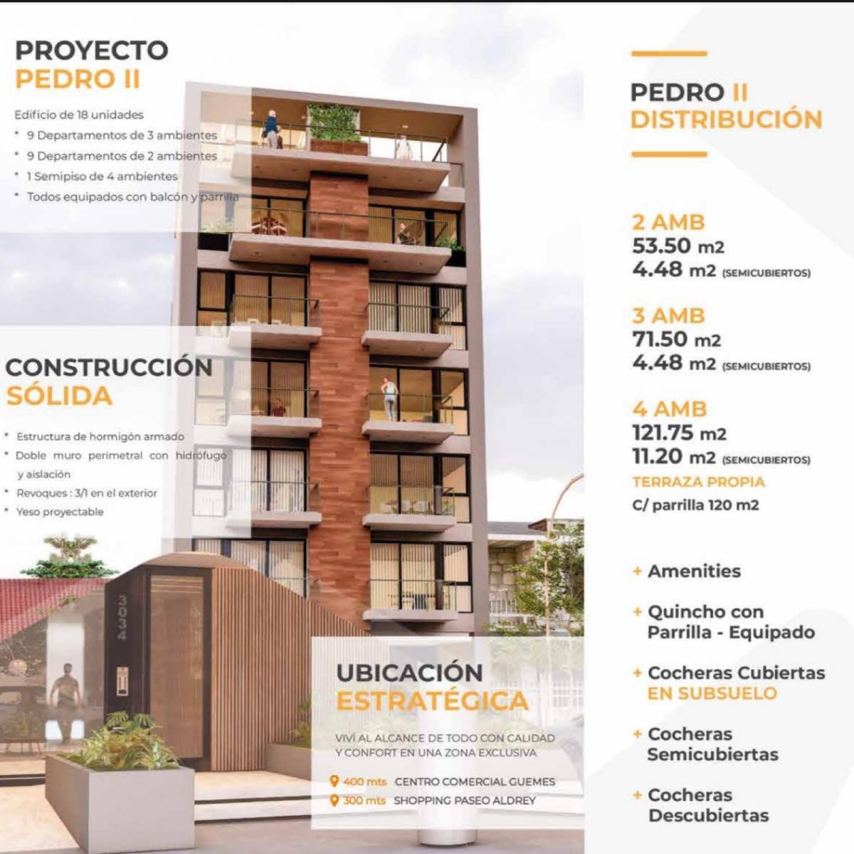 Venta en Pozo! Departamentos 2 / 3 ambientesEDIFICIO PEDRO IIFecha de finalización: Agosto 20272 AMB. 53.50 m2 (4.48 m2 semidescubiertos)3 AMB71.50 m2 (4.48 m2 semidescubiertos)*Amenities*Quincho con parrilla - equipado* Cocheras cubiertas En subsuelo*Cochera semidescubiertas*Cochera DescubiertasDetalle de categoría AscensorAscensor de última generación con todas las normas de seguridad.Revestido en acero inoxidable y piso de porcelanato.Terraza BalcónAmplio espacio semicubierto con baranda de seguridad de aluminio y vidrio.Parrilla Unidades equipadas con parrilla Calidad e innovaciónCarpinterías exteriores de aluminio color negro, doble vidriado hermético (DVH)Puertas de acceso de seguridad con cerraduras de multipunto.Herrajes de primera calidad.Calefacción por losa radiante, alimentada por una caldera de última generación Termostato digital programableCaldera individual Dúo.Cocina diseño ergonómico, amplio espacio de trabajo y guardado, mesada de cuarzo (silestone) con zócalo del mismo material, muebles de diseño en melamina y herrajes de última generación, zócalo de acero inoxidable satinado.Baños con artefacto y griferia de primera calidad, duchas con mampara de vidrio de seguridad.Terminaciones interiores y muros de yeso pintados de blanco.Edificio de 18 unidades* 9 departamentos de 3 ambientes * 9 departamentos de 2 ambientes 1 semipiso de 4 ambientes* Todos equipados con balcón y parrilla.CONSTRUCCIÓN SÓLIDA* Estructura de hormigón armado * Doble muro perimetral con hidrófugo y aislación* Revoques 3 / 1 en el exterior* Yeso proyectable.UBICACIÓN ESTRATÉGICAVivi al alcance de todo con claridad y confort en una zona exclusiva400 mts Centro comercial Guemes300 mts Shopping paseo AldreyNota: las medidas expresadas en mts y mts2 son aproximadas.