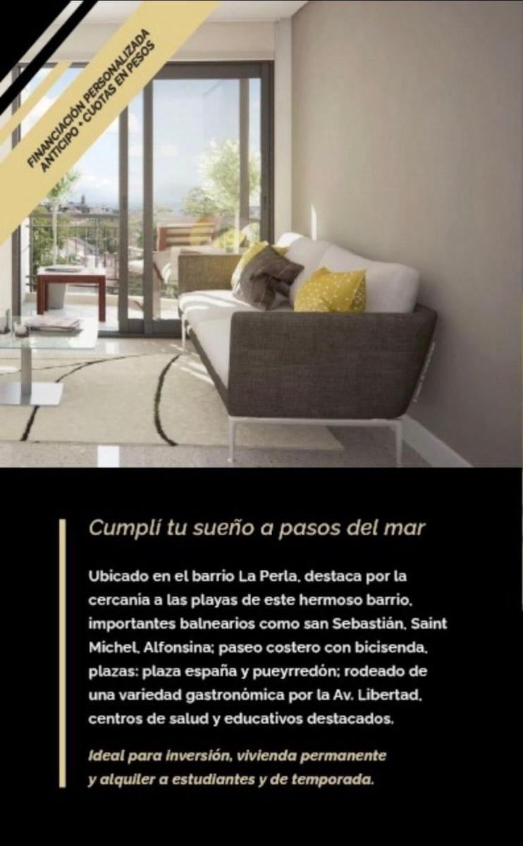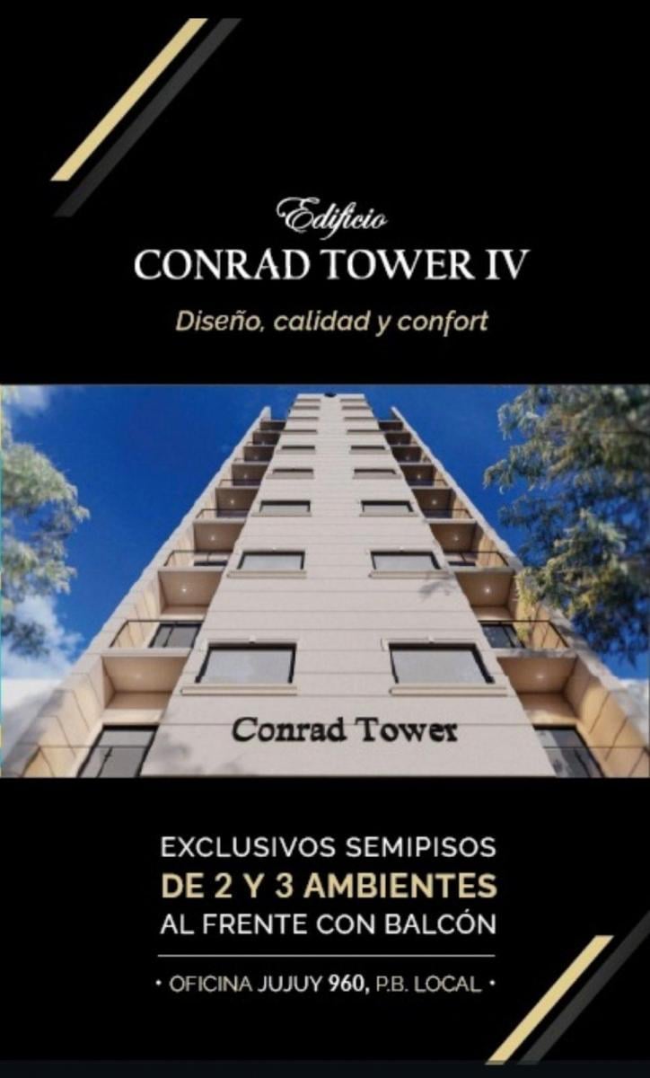 CONRAD TOWER IV. Financiadoentrega marzo / abril 2027.Desarrollo inmobiliario ubicado en el emblemático barrio La Perla a metros del mar. Jujuy 914Exclusivos semipisos de 2 y 3 ambientes con balcón a la calle de superficies de 40 y 55 m2 aprox. Edificio a desarrollarse en 10 plantas, con SUM en último piso, contará con espacios de cochera y baulera.Financiación personalizada. ANTICIPO + CUOTAS... Armamos un plan de pago para vos!!!2 ambientes piso 5 - Valor usd 95.000 50 % de contado / 15 cuotas financiado.(Si la primera entrega es mas alta de puede escuchar oferta)3 ambientes piso 7 - Valor usd 145.000 50 % de contado / 15 cuotas financiado.(Si la primera entrega es mas alta de puede escuchar oferta)ESPACIOS COMUNES• Moderno hall de acceso con pisos de porcelanato y palieres semiprivados.• Ascensor de primera línea en acero inoxidable.• Sistemas de seguridad inteligente en espacios comunes: portero visor, cámaras de seguridad, control de acceso con cierre magnético y portón automatizado con control remoto.• Sistema de iluminación L.E.D• S.U.M en piso 10° con balcón aterrazado equipado con parrilla.TERMINACIONES• Carpintería exterior con D.V.H• Pisos y revestimientos de porcelanato de primera calidad.• Artefactos sanitarios de loza blanca y griferías de primera línea.• Puertas pantografiadas en MDF.• Balcones: baranda de aluminio o hierro negro.EQUIPAMIENTO• Mueble de baño con bacha de loza blanca.• Cocina de diseño en melamina con mesada y pileta de acero inoxidable.• Instalación de calefacción por piso radiante.• Instalación eléctrica con llaves y tomas de primera línea.• Placard en dormitorios.Consultanos!!! Tenemos uno para vos!!!