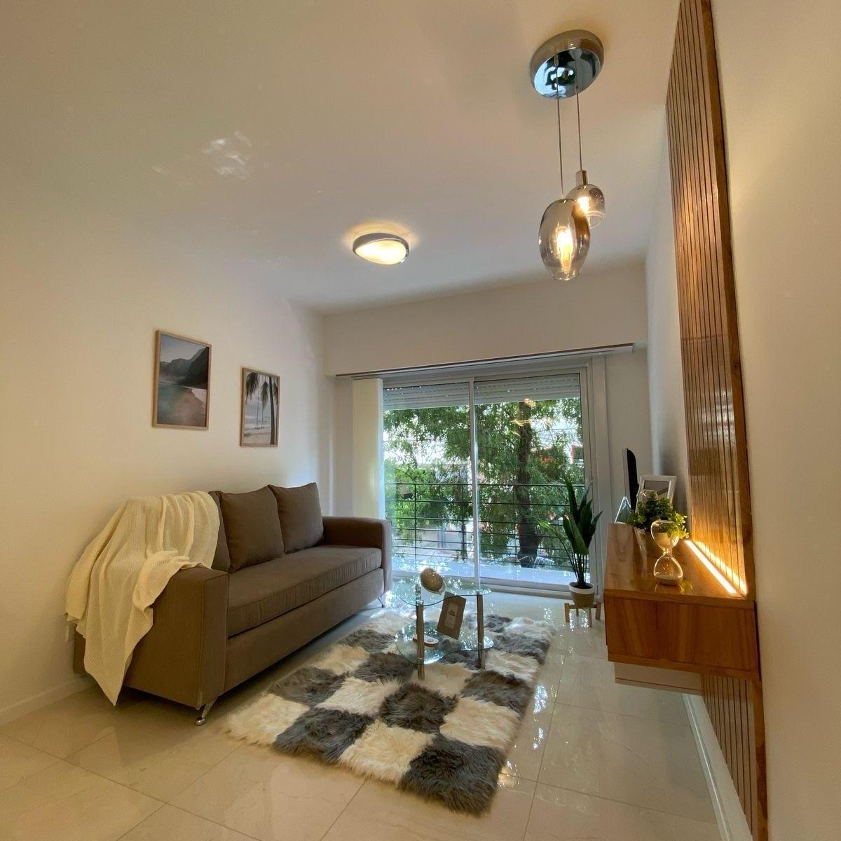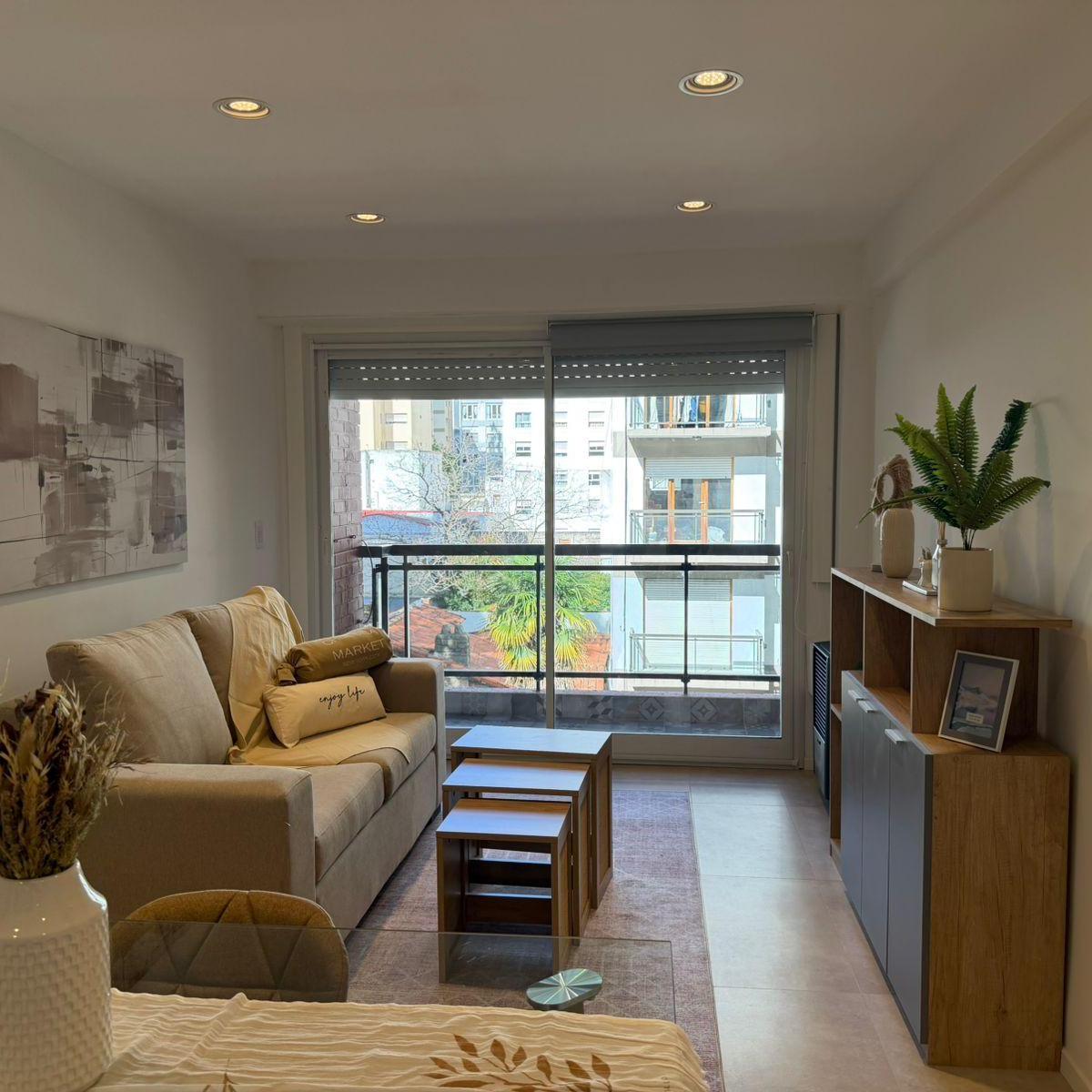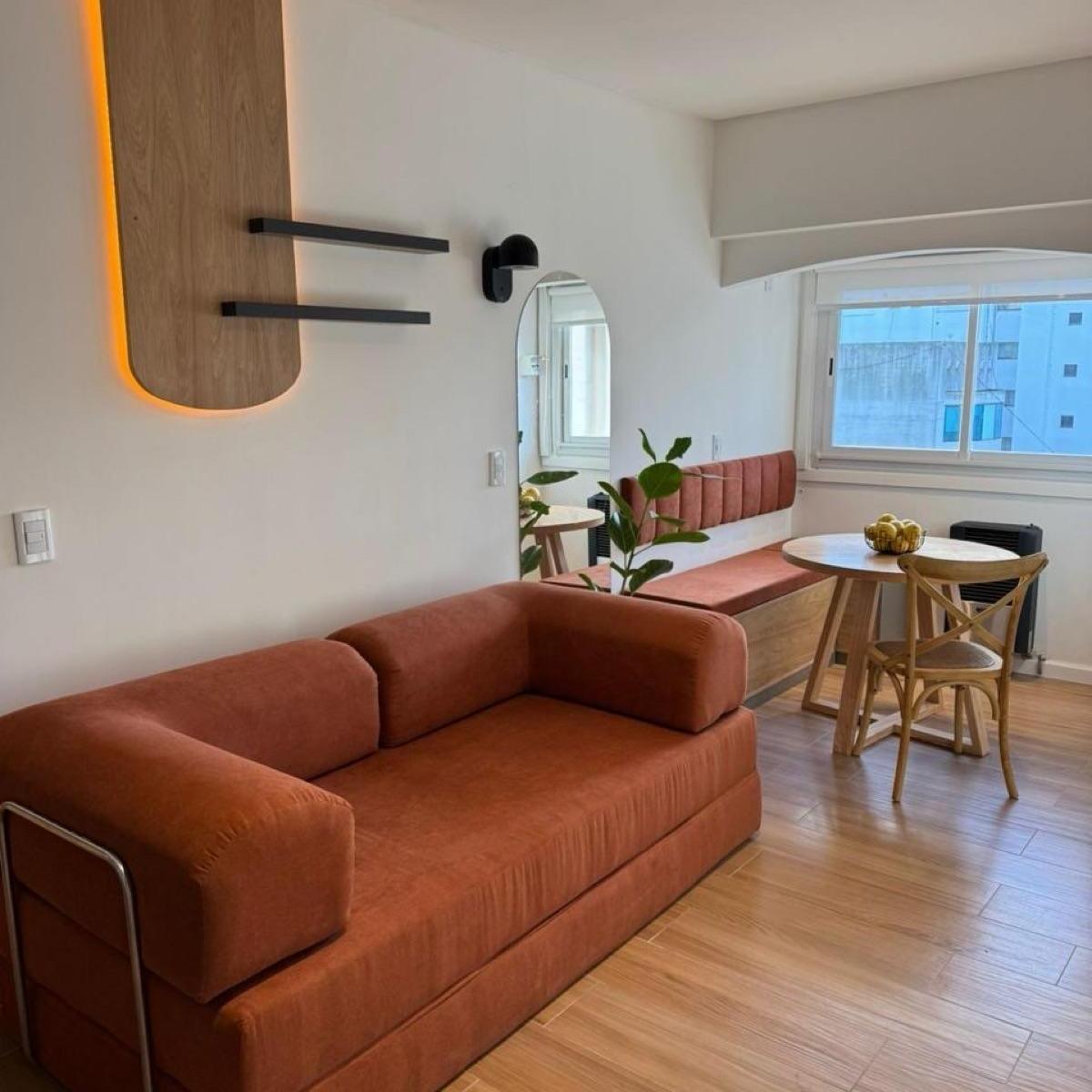 Ambiente de gran tamaño con amplio patio.El ambiente es en concepto desplazado (dividido) al lateral. Se encuentra reciclado Ambiente dividido con amplio ventanal de piso a techo súper luminoso, cama sommier a estrenar de dos plazas, resplado de cama con mesas de luz incorporadas, mesa con 4 sillas a estrenar, rack con TV Smart 32 pulgadas nuevo, aire acondicionado frio calor, plantas, perchero de pie, cortinas, acolchado y decoración.Caja fuerte.PERSIANA ELÉCTRICA.REFACCIONADO. ( se cambiaron cañerías de cocina y baño). Obra de gas hecha en el edificio. Al departamento se le bajaron los techos (COCINA Y BAÑO). Cocina separada con lavadero (equipada con lavarropas a estrenar marca Philips, heladera con freezer nueva marca Philips, microondas nuevo marca Atma, pava eléctrica marca Atma nueva, tostadora nueva marca Atma, cocina semi industrial marca Escorial nueva, extractor TSC nuevo). BODEGA CON VINOS, vajilla, cubiertos tipo hotel, utensilios de cocina Hudson, cafetera estilo italiana Hudson, cacerola Hudson, sarten Hudson, cuchilla Hudson. SUPER COMPLETO.Cortinado a estrenar. (COCINA Y AMBIENTE). SE ENTREGA CON VAJILLA PARA DOS PERSONAS, SÁBANAS Y TOALLAS. (NO LE FALTA NADA. LISTO PARA HABITAR O ALQUILAR).Baño completo con mampara, inodoro y bidet Ferrum línea Bari, vanitory madera blanca laqueado, griferia Piaza, secador de pelo (tipo hotel) y todo el equipamiento de baño.PATIO, detalles en madera, mobiliario, iluminación solar, salida de agua nueva y gas (para futura parrila gas).VALOR: U$S 68.900Mts 24 cubiertos aprox.Mts 19 descubiertos aprox.Total aprox. 43. MtsExpensas $ 110.000 aprox.Nota: las medidas expresadas en mts y mts2 son aproximadas.